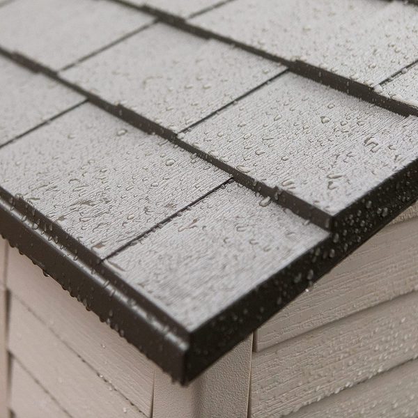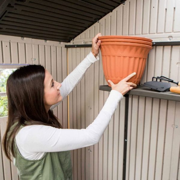 Ideal outdoor storage solution for all garden tools and equipment, BBQs, bicycles and DIY tools. Elegant wood affect exterior with double doors, plus ventilation ducts for air circulation. Floor panel with integral window for natural lighting and padlock hasp for optional added security. Made out of a durable, maintenance and fade-free weather-resistant plastic. It is resistant to rot, decay and other damage.